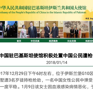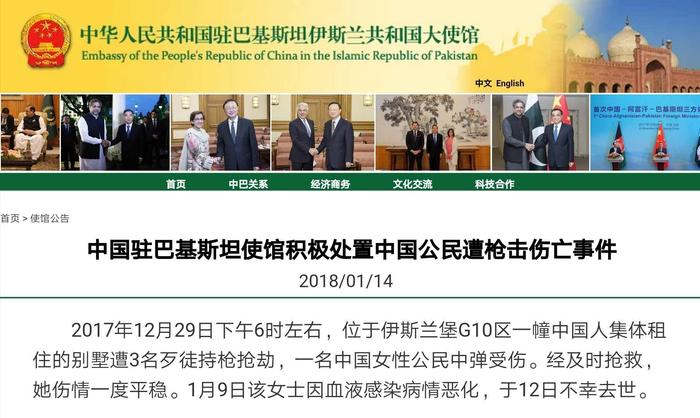 ​据中国驻巴基斯坦使馆14号发布公告称, 当地时间2017年12月29日下午6时左右,位于巴基斯坦首都伊斯兰堡G10区一幢中国人集体租住的别墅遭3名歹徒持枪抢劫,一名中国女性公民中弹受伤。经及时抢救,她伤情一度平稳。1月9日该女士因血液感染病情恶化,于12日不幸去世。