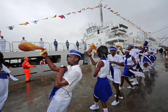 在莫桑比克马普托港码头,莫桑比克当地民众跳起民族舞蹈欢迎中国海军和平方舟医院船首次到访。江山摄