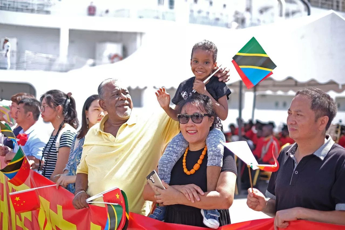 在达累斯萨拉姆港码头,坦桑尼亚小朋友挥动中坦两国国旗与家人一起欢送中国海军和平方舟医院船离开坦桑尼亚。江山摄