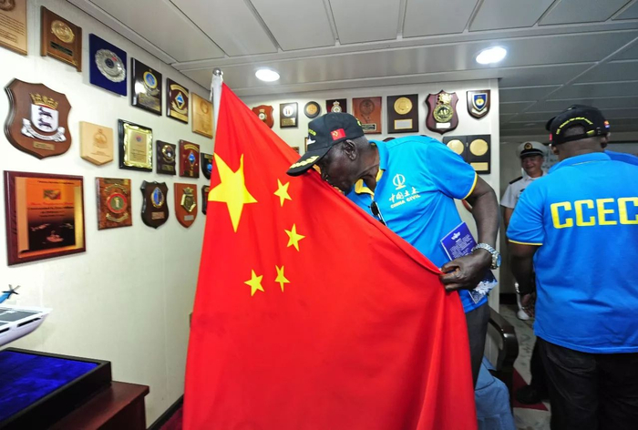 80岁的坦赞铁路老员工、费南加(MFINAGA)在参观和平方舟医院船时,激动地亲吻中华人民共和国国旗。江山摄