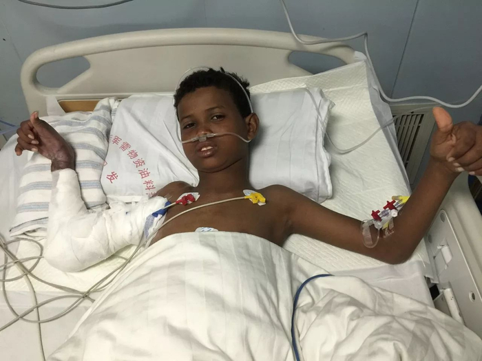 吉布提9岁小孩阿普迪卡依手术后向主刀医生纪世召举起了大拇指。