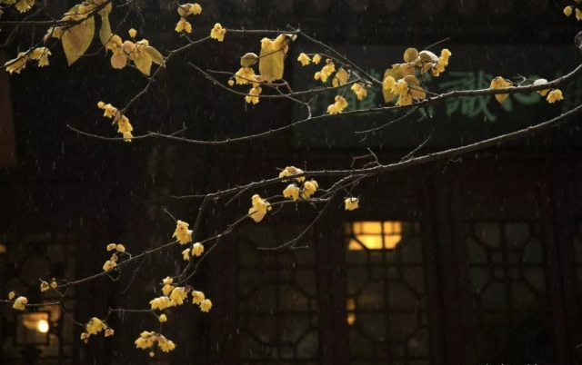清初《花镜》载:“蜡梅俗称腊梅,一名黄梅,本非梅类,因其与梅同开,其香又近似,色似蜜蜡,且腊月开放,故有其名。”