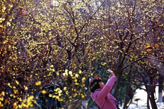 |兴庆宫公园内近千株蜡梅逐渐开放,蔚然成林,散发着浓浓的幽香|