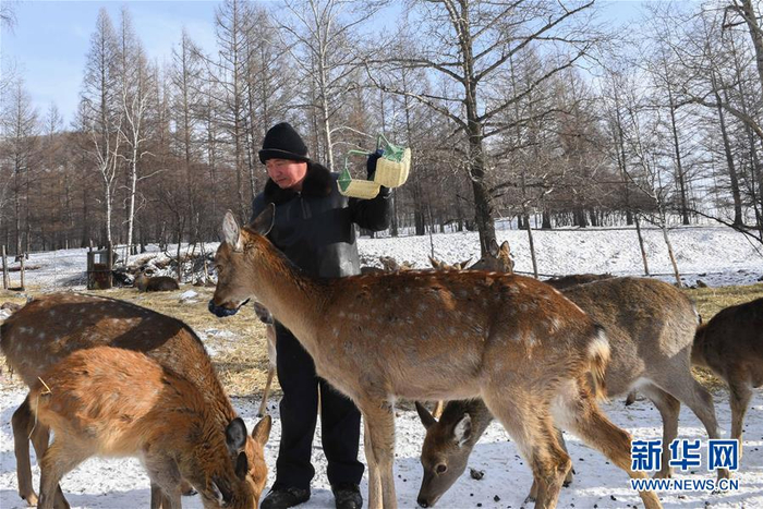 1月9日,阿尔山市白狼镇鹿村的郑晓林在鹿园饲养梅花鹿。2009年郑晓林从林业部门下岗之后,开始养殖鹿、野猪。现在,他的特色养殖园让6名林区下岗职工再就业,每年还为24户贫困户分红。 新华社记者 刘磊 摄
