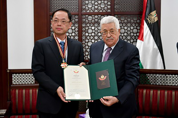 会见前,巴方举办隆重授勋仪式。阿巴斯总统授予陈兴忠“耶路撒冷之星”勋章。
