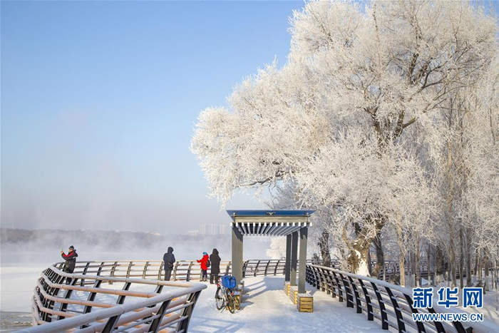 1月11日,人们在吉林市江滨公园欣赏雾凇景观。当日,吉林省吉林市松花江畔出现雾凇景观。 新华社发(朱万昌 摄)