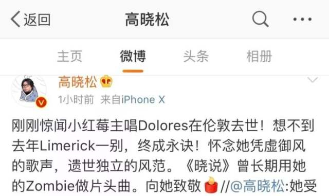高晓松微博截图。(图片源自网络) 爱尔兰小红莓乐队上世纪90年代成立,其在全球乐坛的地位不容小觑,尤其是推出《Linger》《Zombie》等歌曲后名声大噪,全球唱片销量超过2500万张。