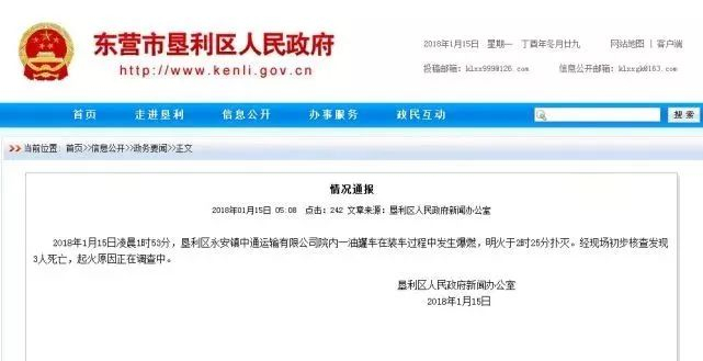 2018年1月15日凌晨1时53分,山东东营垦利区永安镇中通运输有限公司院内一油罐车在装车过程中发生爆燃,明火于2时25分扑灭。
