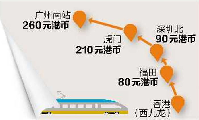 若按当前汇率计算,广深港高铁香港段日后开通后,从香港西九龙总站至福田站、深圳北站、虎门站及广州南站,票价分别为港币80元(按1月15日汇率折算,约为人民币66元)、90元(约为人民币74元)、210元(约为人民币173元)及260元(约为人民币214元)。
