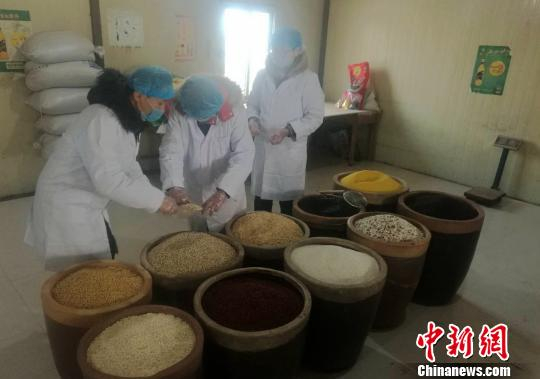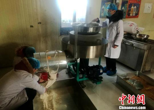 图为王东营与儿子在封装五谷杂粮。 刘鹏 摄