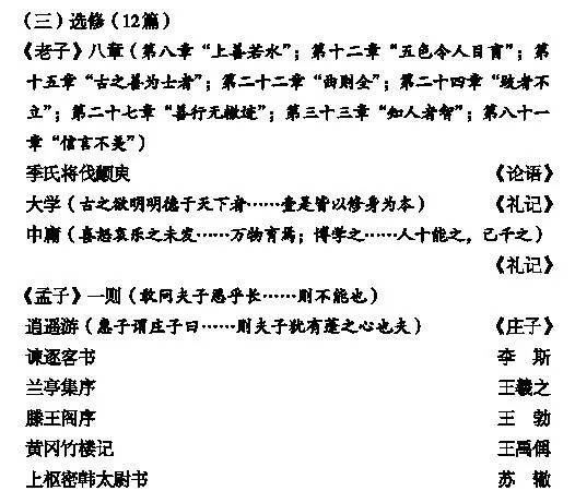 在“课内外读物建议”部分,除保留原有《论语》《孟子》《庄子》外,增加了《老子》《史记》等文化经典著作,要求学生广泛阅读各类古诗文,覆盖先秦到清末各个时期。