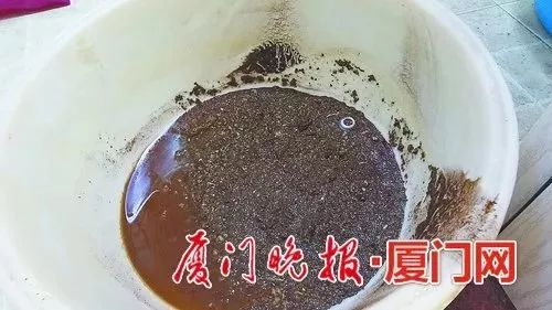 清洗结束后,污水口下面接污水的盆里已经积了厚厚一层杂质,这些杂质呈黄褐色,整个浴室里还弥漫着一股铁锈的气味。