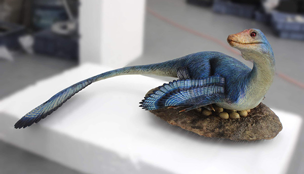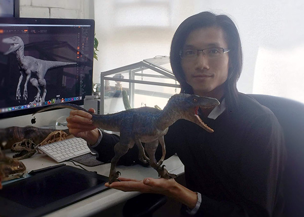 老搭档张宗达2015年重新开始创作恐龙。从动画公司离职后,他自己开办画室,逐渐向商业转型,从2D到3D摸索出雕塑和打印模型的市场。那年恰逢《侏罗纪世界》上映,他做了一款伶盗龙小蓝,卖得很好,也略带点无奈:还是电影流行文化中的恐龙形象受欢迎,可惜不一定科学。