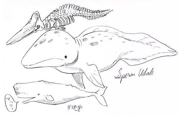 村田雄介漫画中,抹香鲸的骨架、“未来人类的想象复原图”和真实的抹香鲸。图片来源:宁静海的菊石君