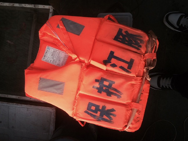 2016年3月,长鲸吟在鄱阳湖做江豚种群调查,图为救生服。采访对象供图