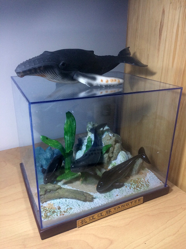 长鲸吟的书桌上摆着大翅鲸和江豚模型。采访对象供图