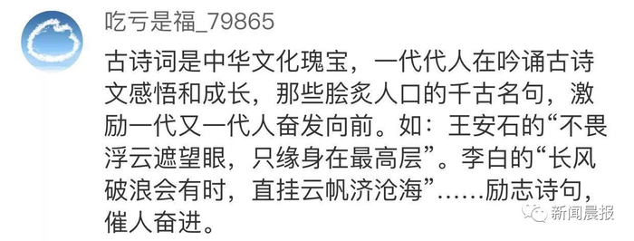 @考槃于心:如果我上高中时让背这么多该多好啊,毕竟我那时还能背过,现在……现在没有早读时间,工作累早上也起不来,哪怕起来背也怕打扰到楼上楼下。 个人认为,多背这些是好事,等大学了,等毕业了,看到什么落霞会想到“落霞与孤鹜齐飞”而不是“卧槽好美”,到了中秋会想到张九龄的《望月怀远》。多好啊!
