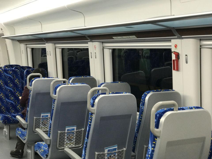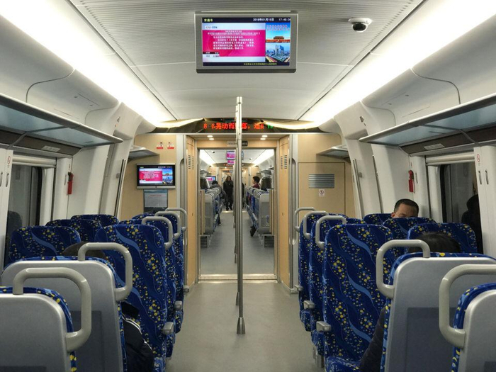 17:59 动车关闭车门关闭,车厢空座较多,车座下方配备五孔插座,车座不可调节倾斜角度