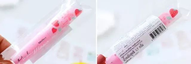 别看这款小唇膏包装简陋,这是泰国产品的特色,简简单单才能节约成本嘛。外貌还是很小可爱的,少女粉带小草莓图案,少女心突然萌发了……细细小小一支随身携带非常合适。
