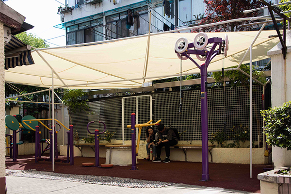 但根据规土部门规定,私自搭建任何带有固定屋顶的建筑物都是违章搭建,由政府主导实施的项目自然也不能例外,因此场地内只能做构筑物。这意味着雨棚的顶不可以固定,必须可开闭。考虑到居民都是中老年人,手动开合不方便,李彦伯团队最开始想做个全自动开合的方案。但由于户外设施对耐候性要求较高,该方案的造价也远远超出了预算,这个方案只好不了了之。