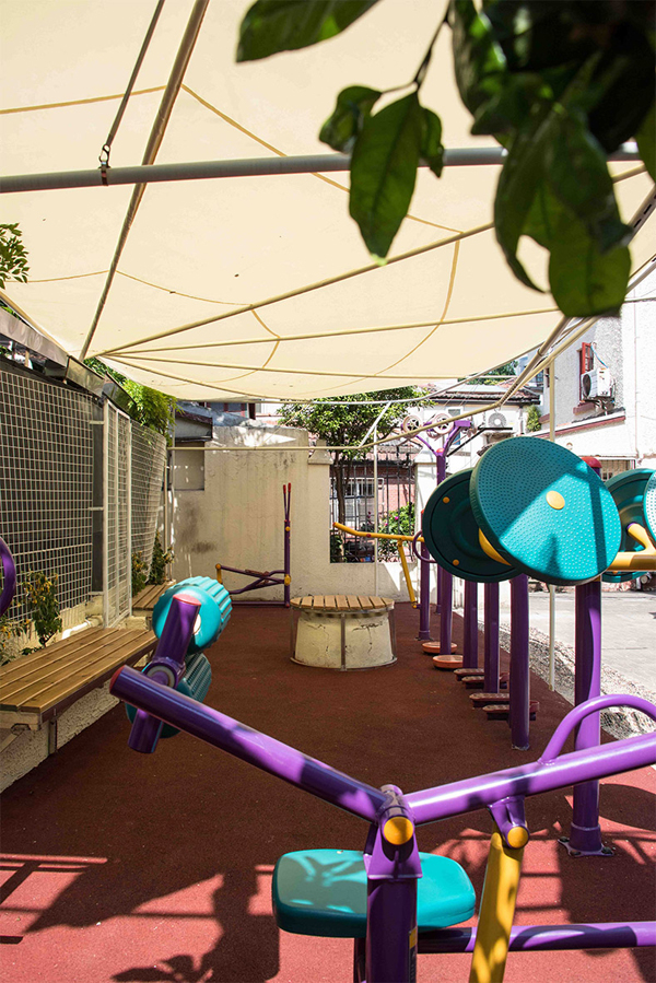 因势利导之下,李彦伯团队将方案推倒重来,改作手动开闭方案。为了减轻雨棚活动机构的重量,李彦伯设计了特殊的套管结构,使之既能满足荷载要求又轻质易操作。团队参照居民晾衣的日常性动作设计了开闭的操作方式,还设计了专用的全金属铸造的开闭工具,使用这个工具可以更迅速地打开雨棚。雨棚下方,除了晒衣和健身的功能,还提供了木质长椅和易养护的绿植,方便居民闲时乘凉聊天,促进邻里间的交流。李彦伯认为,这种复合功能的整合,为历史住区植入了“社区活力发生器”。