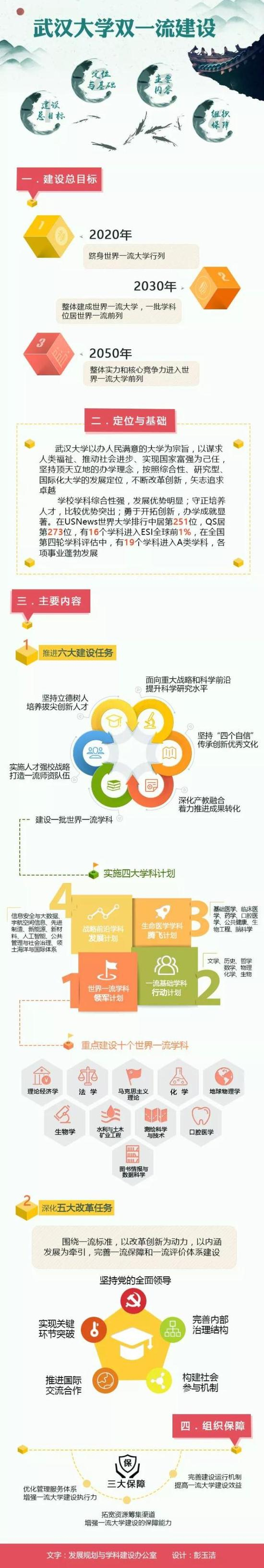 《方案》提出:到2020年,武汉大学初步建成中国特色世界一流大学;到2050年,学校整体实力和核心竞争力进入世界一流大学前列。让我们一图了解《武汉大学一流大学建设高校建设方案(精编版)》的具体内容。