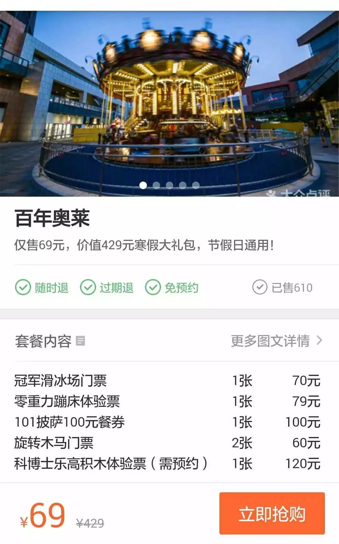 吃喝玩乐在奥莱,大众点评/美团69元抢购429元寒假大礼包!