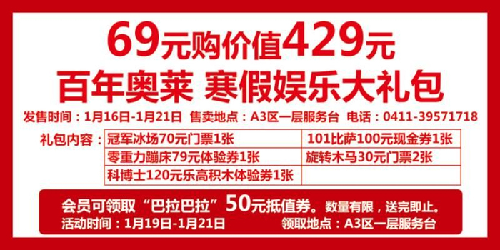 活动内容:活动期间,可在大众点评和美团线上及百年奥莱A3一层服务台69元购买价值429元的寒假大礼包。数量有限,售完即止。使用有效期至2018年1月31日。