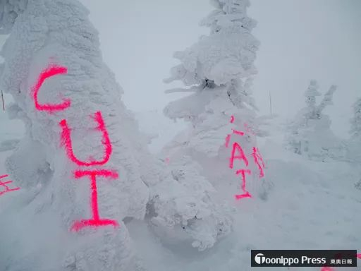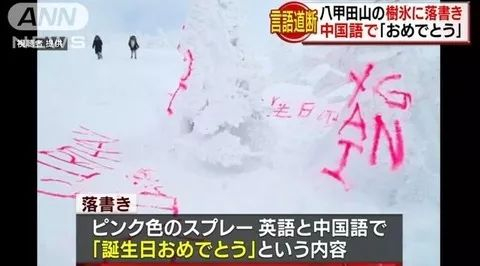 据日本ANN电视台15日报道,事发现场位于“八甲田山”山顶公园车站附近,五棵冰树上被红色荧光喷漆用英文和中文分别书写了“HAPPY BIRTHDAY”和“生日快乐”。