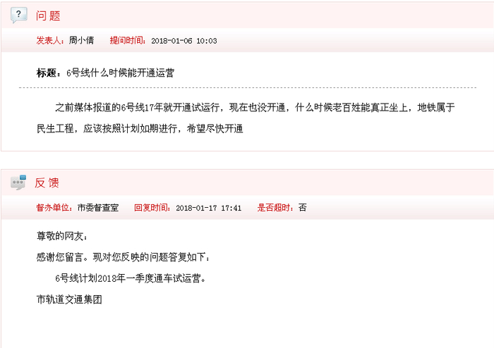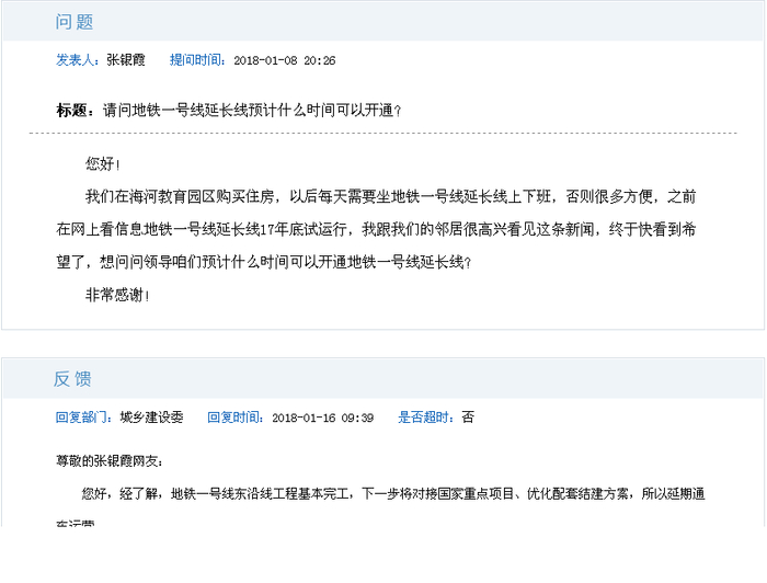 日前,网民“张银霞”在《政民零距离》:请问地铁一号线延长线预计什么时间可以开通?