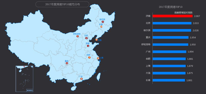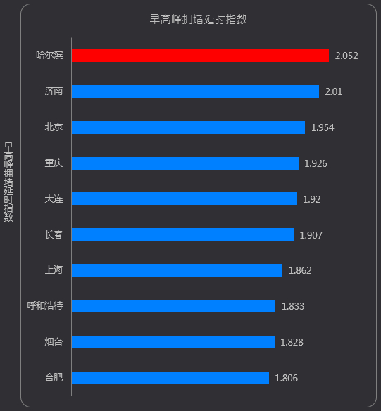 从最拥堵的早高峰TOP10城市分布来看,多数位于北方,如济南拥堵延时指数达2.01,北京拥堵延时指数达1.954,分列榜单二三名。