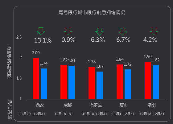 此外,石家庄、唐山、洛阳尾号限行后拥堵降幅分别达到6.3%、6.7%和4.2%。