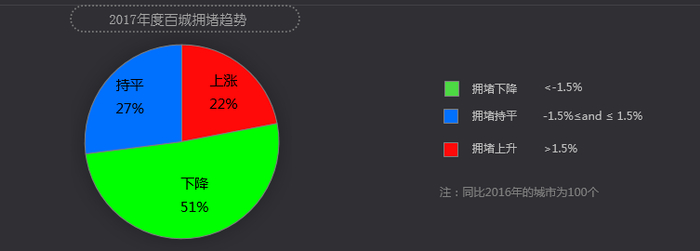 同比2016年,有51%的城市拥堵下降,27%的城市拥堵基本与去年持平,22%的城市拥堵出现上涨。