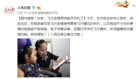 人民日报:【东航:1月18日起,#飞行可开手机#!】想要在飞行时用手机,请注意:①请打开手机飞行模式,全程关闭蜂窝移动通信功能。②在飞机滑行、起飞、下降和着陆等阶段 ,手机不允许连接耳机、充电线等配件。③不具备飞行模式的移动电话等设备,在空中仍然被禁止使用。收藏,备用!