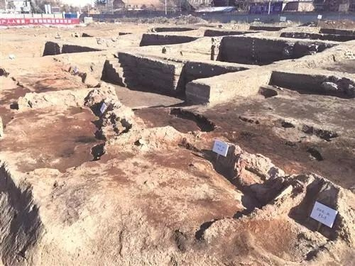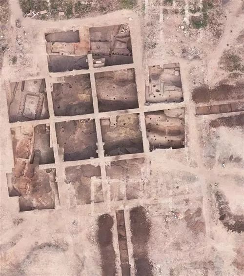 2017年下半年,考古队员在遗址中、西部与北部布10×10米的探方13座,揭露面积1230平方米,共揭露各类遗迹87座,包括房址14座、灰坑66座、灰沟7条。有趣的是,去年发掘清理出的14座房屋遗址并不在同一个地平层面上,房屋类型也不相同。遗址西部被分别命名为F1-1、2、3、4、5的房屋,是一处从北向南共五间房屋相连的联排房屋,遗迹中可以见到房屋残存的红烧土墙,残墙最高的部分大约有40多厘米。而遗址中部房屋建造的地平面比西部房屋要低近半米的深度,从残存的房屋柱洞来看,这些房屋不是联排结构,而是相对独立的房屋,南北几排房屋之间还挖有水沟。根据房屋建造方式和土层中包裹物的不同,考古专家推断,遗址中部地平面更低的独立房屋应属于商代晚期,遗址西部的联排房屋则属于西周早期,并且从遗迹上判断,从商代晚期到西周早期之间的人类活动,出现过断档。