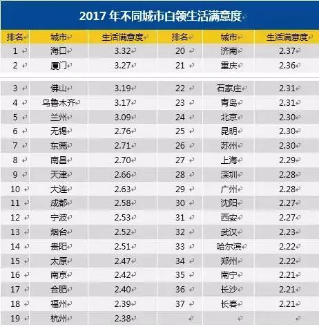 根据调查结果显示,2017年白领生活满意度最高的城市为海口,其次为厦门,满意度分别为3.32和3.27。而竞争激烈的北上广深则都在20名开外。