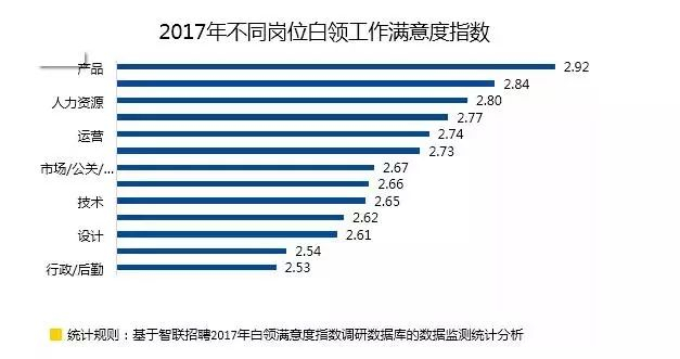 得益于“互联网+”的浪潮和人工智能的火爆,产品和研发逐渐成为人气岗位,在公司重要和受欢迎程度不亚于网络上的人气网红。报告显示,产品、研发岗位的白领工作满意度较高,分别为2.92和2.84。