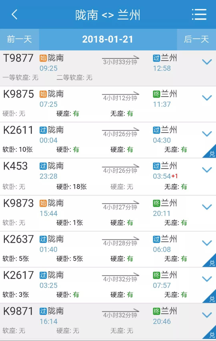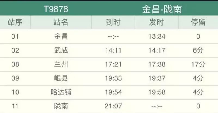 ▲金昌至陇南列车时刻表