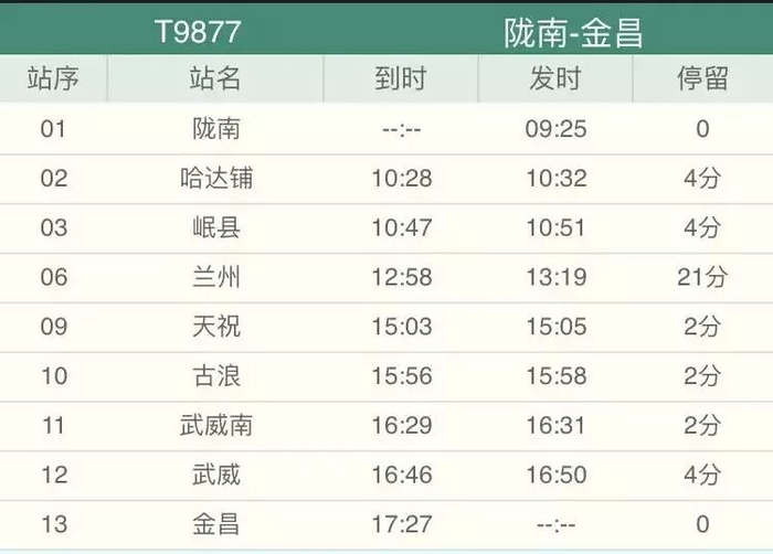 陇南至金昌T9877次列车次日9时25分陇南开,17时27分到金昌。列车编组8辆,其中软座7辆,发电车1辆。