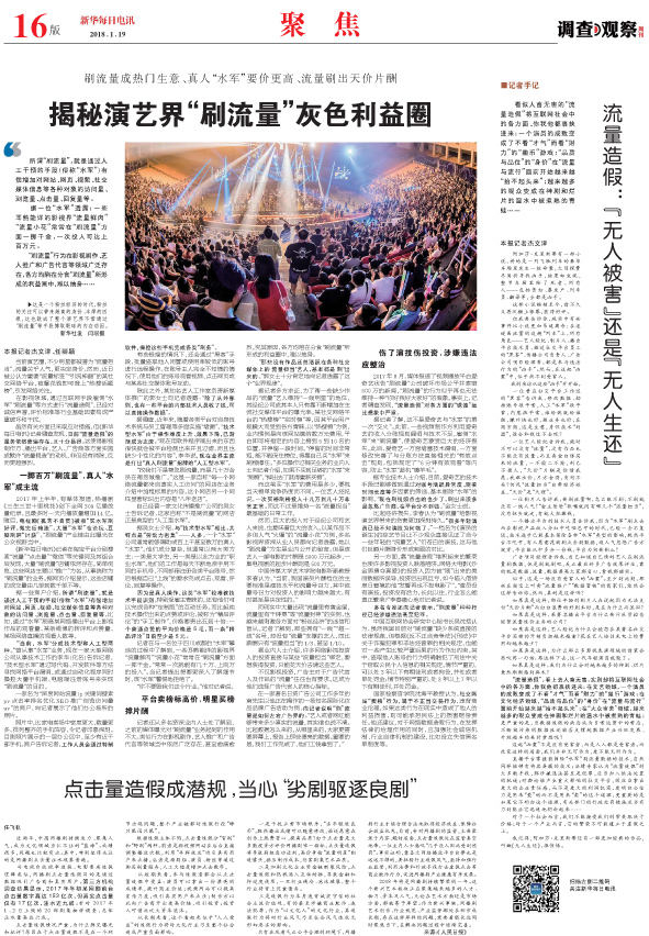 记者还从多名资深业内人士处了解到,之前的媒体曝光对“刷流量”业务起到的作用不大。类似行为在影视剧作、艺人推广和广告代言等领域当中依然广泛存在,甚至愈演愈烈。究其原因,各方均陷在分食“刷流量”所形成的利益圈中,难以抽身。
