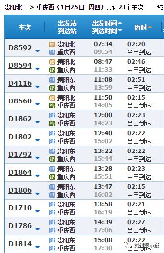 贵州都市报记者通过12306网站获悉,1月25日当天由贵阳北出发的首趟列车是贵阳北至重庆西D8592次,该次列车早上7时34分由贵阳北开车,当天早上9时54分到达重庆西。