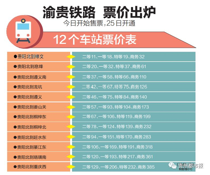 渝贵铁路开通后,重庆西至贵阳北全程二等座票价为129元,成都东至贵阳北全程二等座票价为275元。从1月19日起,旅客可在各渠道购买到开通首日及以后的渝贵铁路列车车票。