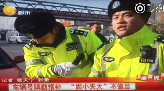 交警开始教育老车主:“根据交通法规定,你的职责不光是开车,你还有一个职责是保持号牌清晰、完整、不受任何污物污染,为什么?它是证明车辆的保证。”
