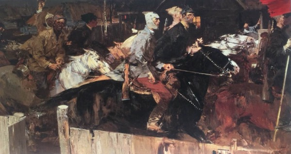 此次展览中,最为重量级的作品是莫伊谢延科完成于1962年的《红军来了》。“晚上,村里亮着灯火,红军骑兵的先锋队沿着狭窄的小路飞驰而去,我想近距离展现他们的高大形象,以便让观众记住这些亲切的面孔。他们经历战火的洗礼,饱尝饥饿和病痛的折磨,但对正义的事业仍充满信心。我想让观众看到的不仅仅是红军来到村子的场面,而要使人感到正是这些人把红旗插到了俄罗斯的每一个角落。” 莫伊谢延科在日后的回忆中如此描述自己创作的表达。