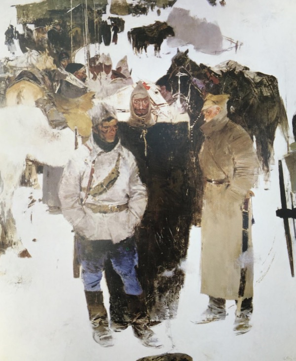 而《同志们》和《胜利》上描绘的人物形象既不是具体哪个人,也没有特别情节,作品给观者留下了联想和思考的空间,似乎是画面中人领导着骑兵团走向胜利。