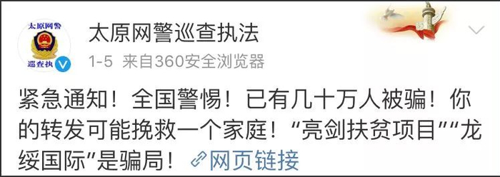1月初,太原市公安局网安支队和山西省人民政府新闻办公室也发布通告,所谓的“龙绥国际”微信群涉嫌传销、非法集资、网络诈骗等违法行为!