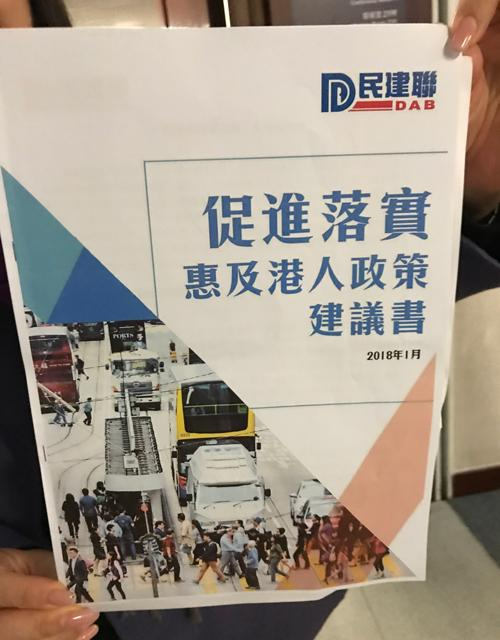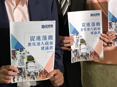 民建联经过深入研究和广泛咨询, 撰写了《促进落实惠及港人政策建议书》,就创业、就业促进落实和生活三方面提出了一些建议。诸如“给予港人内地身份证明”、“豁免港人在内地就业许可”、“鼓励希望服务国家的港人申请内地公务员职位”、“容许香港人参军入伍”、“推动央视等内地电视频道全面于香港落地并免费转播 ”等20项具体建议。
