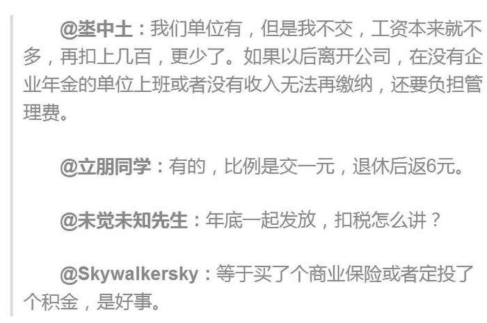 对于企业年金,网友们不淡定了:有的表示认同,有的则认为还是自己的钱自己支配比较稳当。