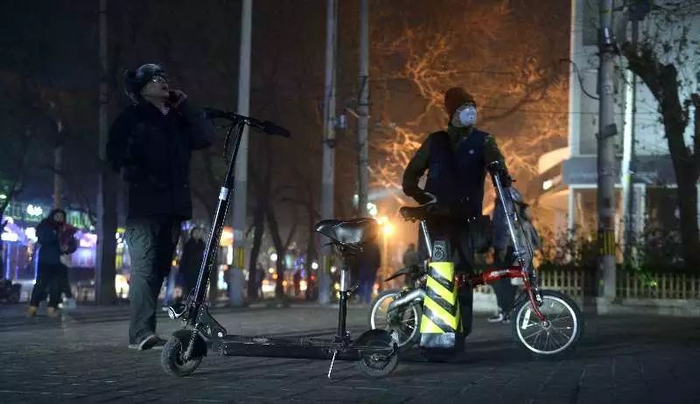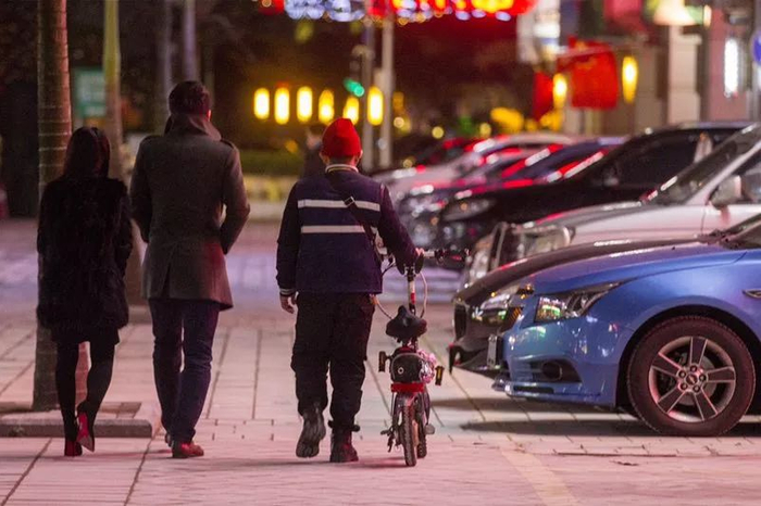 ↑2017年冬季的一个夜晚,在北京国贸附近,e代驾的司机正在准备接单。 周琳摄。