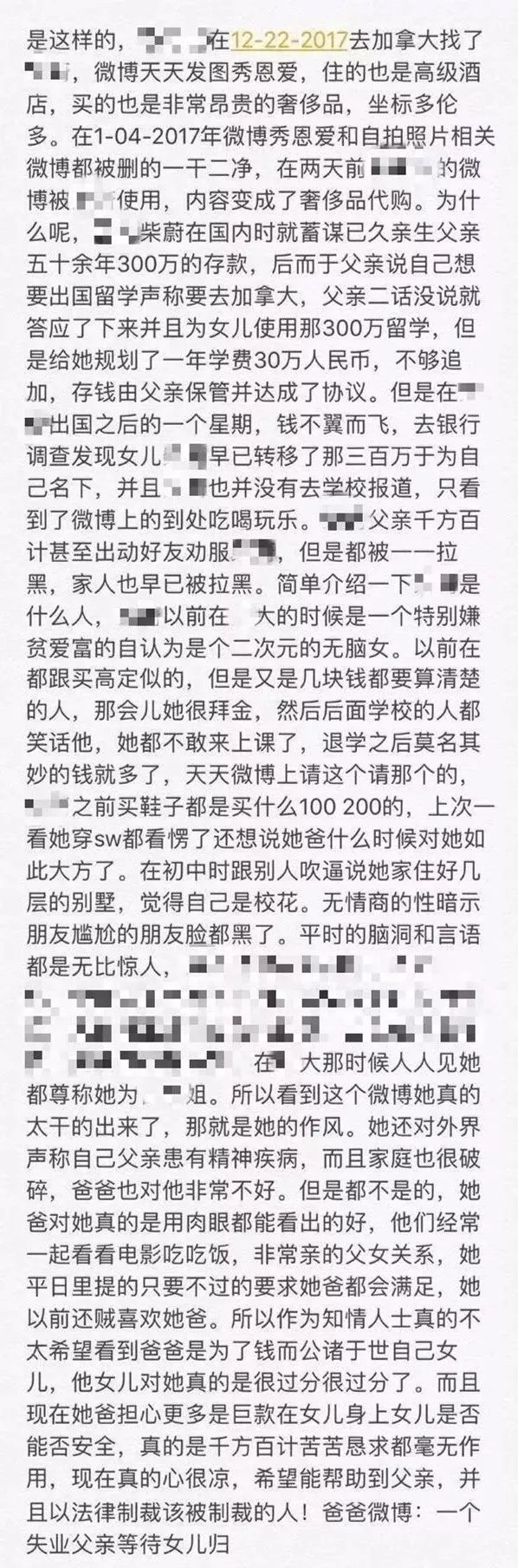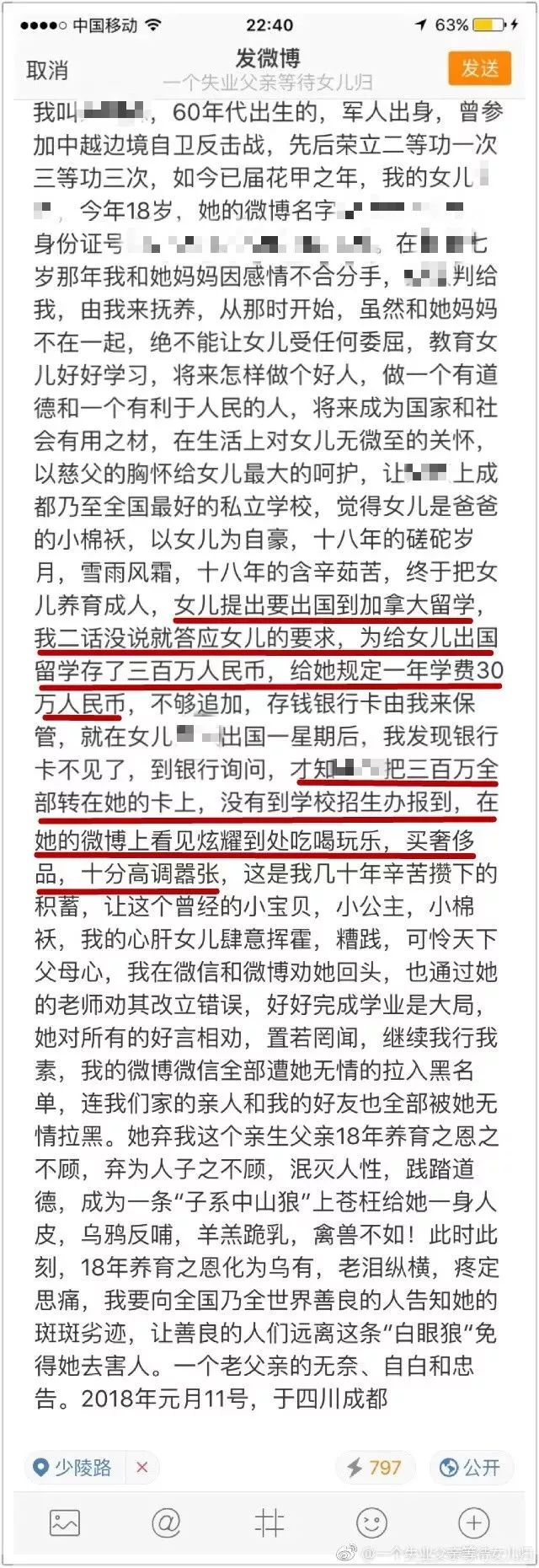 挥霍父亲300万积蓄,还把全家人拉黑!绝望父亲微博手撕留学加拿大的18岁女儿